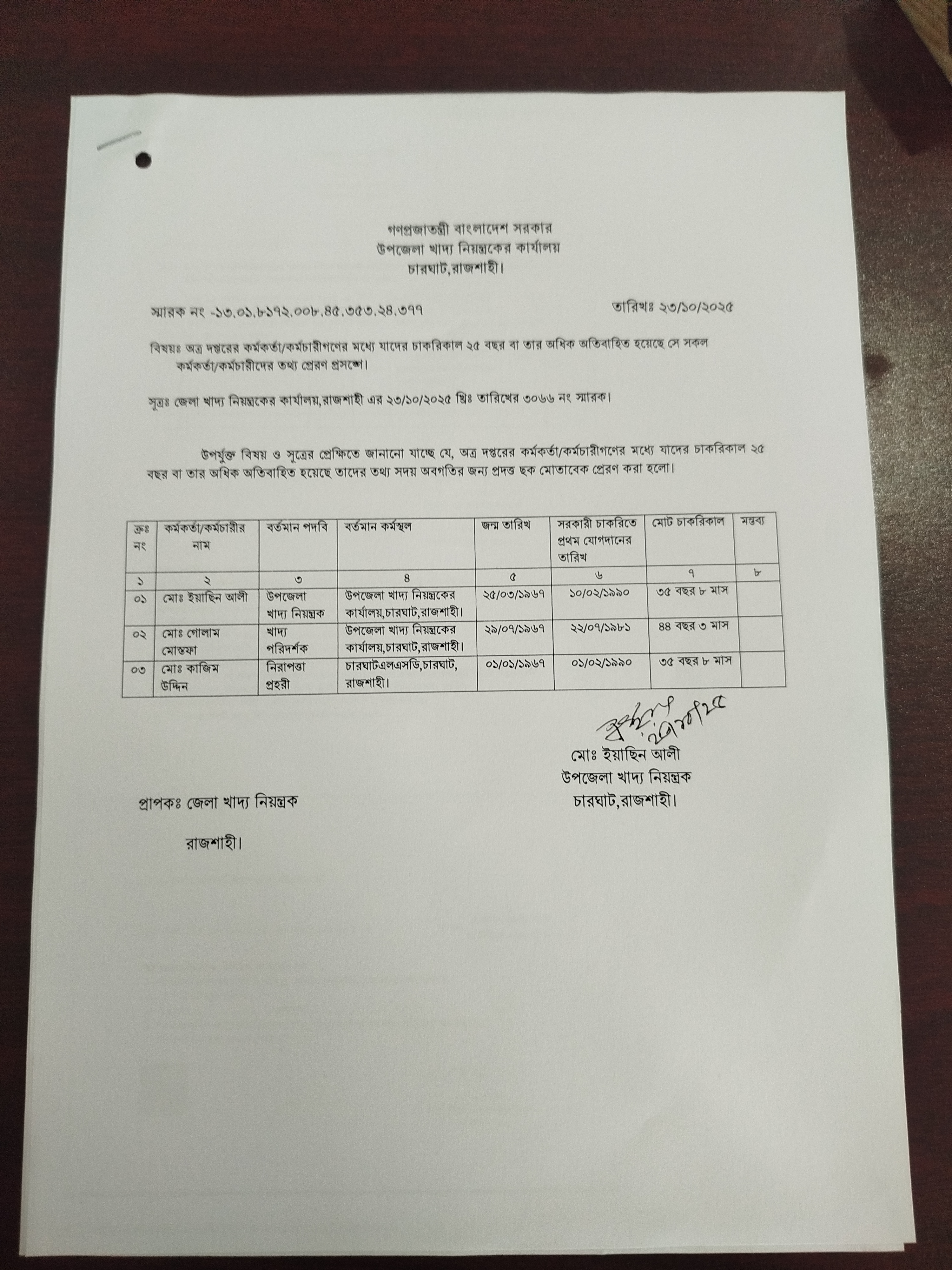 চাকরি কাল ২৫ বছর বা তার অধিক অতিবাহিত হয়েছে সে সকল কর্মকর্তা কর্মচারীদের তথ্য প্রেরণ প্রসঙ্গে।
